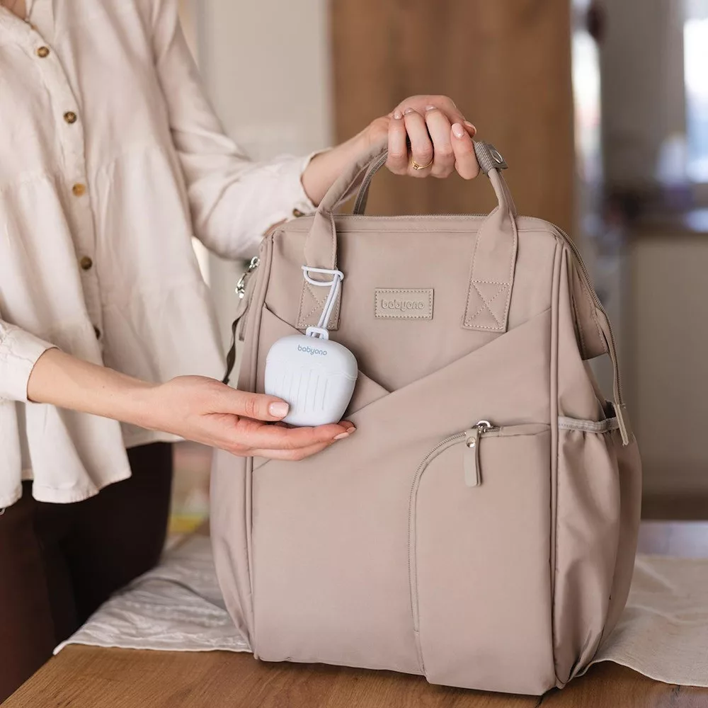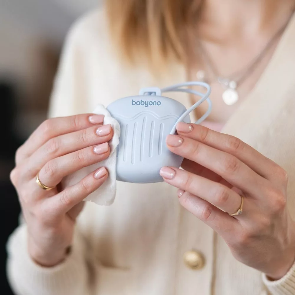 A BabyOno szilikon cumitartó tok (1656/01) azoknak a szülőknek készült, akik a praktikusság mellett a higiéniára és a tartósságra is nagy hangsúlyt fektetnek. A tok két cumi egyidejű tárolására alkalmas, így mindig van kéznél egy tiszta tartalék. A szilikon anyag rugalmas, ellenáll a mindennapi igénybevételnek, és rendkívül könnyen tisztítható – akár folyó víz alatt is. Az egybenyitható kialakítás gyors használatot tesz lehetővé, miközben a cumik biztonságosan a tokban maradnak. A praktikus akasztópánt segítségével a cumitartó egyszerűen rögzíthető babakocsira, pelenkázótáskára vagy hátizsákra, így ideális sétához, utazáshoz és mindennapi rohanáshoz is.