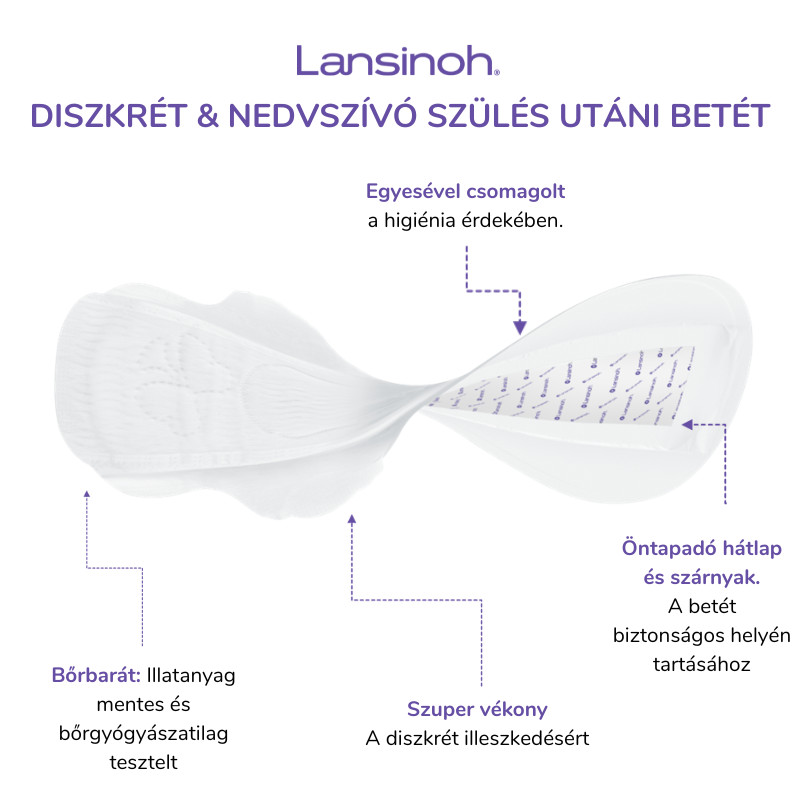 A diszkrét kismama betéteinket a szülés utáni 2. héttől való használatra fejlesztették ki, amikor a szülés utáni vérzés csökkenni kezd, és elkezdesz aktívabbá válni. Szülés utáni második héttől, akár a teljes gyermekágyas időszak alatt (6 hét) használd az erre az időszakra kifejlesztett, a kisebb mennyiségű gyermekágyi váladék, a lochia felfogására szolgáló betétet. Gazdaságos betét, mert fixen tartó tapadócsíkja és szárnyai miatt, pamut fehérneműddel használhatod.  Ne tedd ,,hálós” vagy egyéb egyszer használatos,illetve száras fehérneműbe! A Lansinoh diszkrét és nedvszívó szülés utáni betét szuper vékony, átlélegző, szárazon tartó, puha és selymes, nem dörzsöli az érzékeny  gáttájékot. Hátul szélesedő forma a nagyobb biztonságért. A betét bőrbarát, illatanyag mentes és bőrgyógyászatilag bevizsgált. Formatervezett és diszkrét, hátul szélesedő formája nagyobb védelmet nyújt. Biztonságosan a helyén marad, amit a betéten végigfutó tapadócsík és az elején és hátulján lévő 2 pár rögzítő szárny biztosít. Gazdaságos és kényelmes, mert saját fehérneműddel is használhatod az átázás veszélye nélkül! A mamák minden igényét kielégíti. Stresszinkontinencia esetén is kiemelten ajánlott! Várandós időszakban gyakori stresszinkontinencia, valamint az idő előtti burokrepedés, magzatvíz szivárgás esetén a „csíramentes” betét használata kiemelten ajánlott. Használata: Elölről helyezd be a betét. Először a hosszanti tapadócsíkot távolítsd el, aztán az első szárnyakat, majd a hátul lévőt fixáld a pamut fehérneműdhöz. Cseréld a betétet 4-6 óránként, vagy szükség esetén gyakrabban. A doboz tartalma: 12 db egyesével csomagolt kismamabetét.