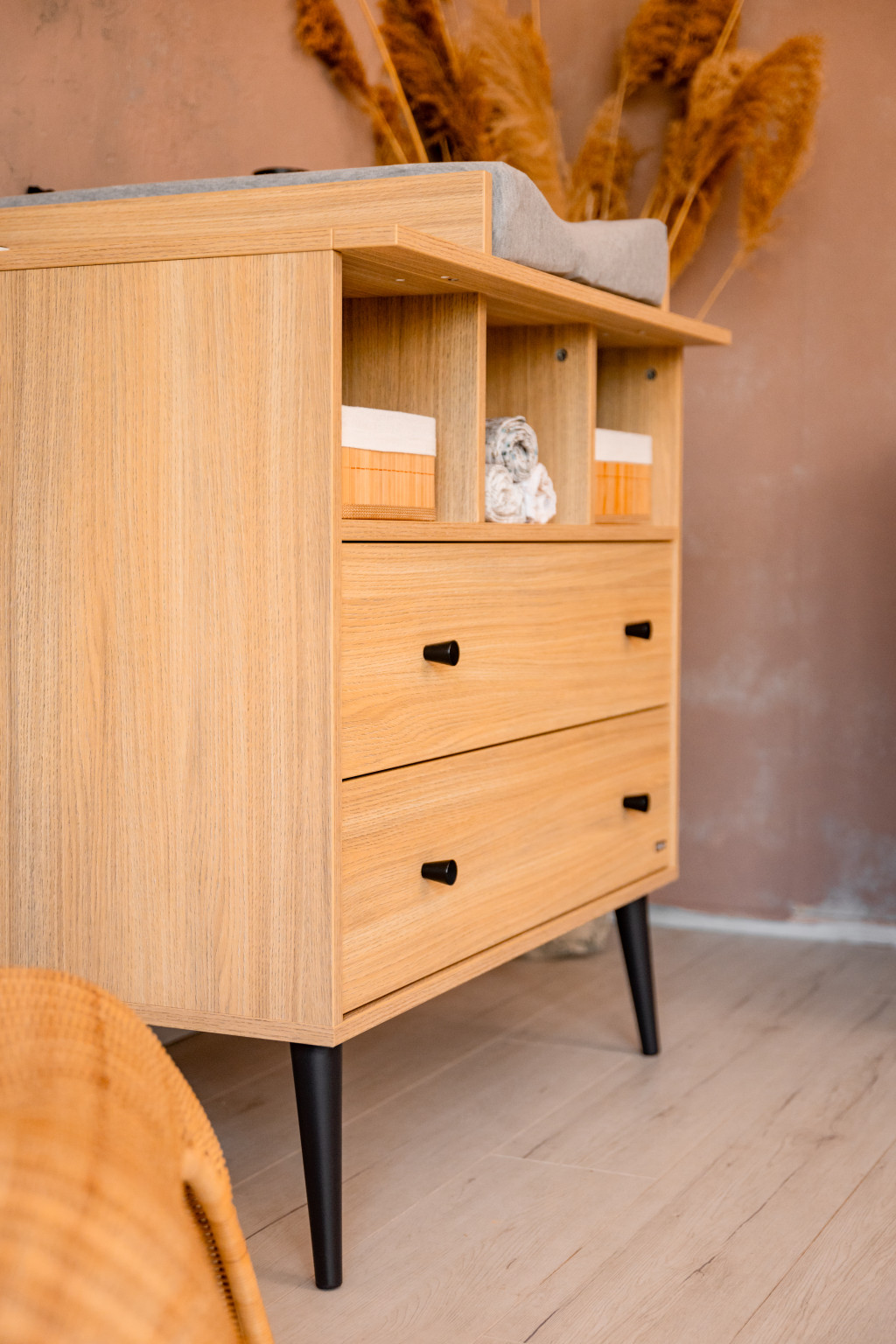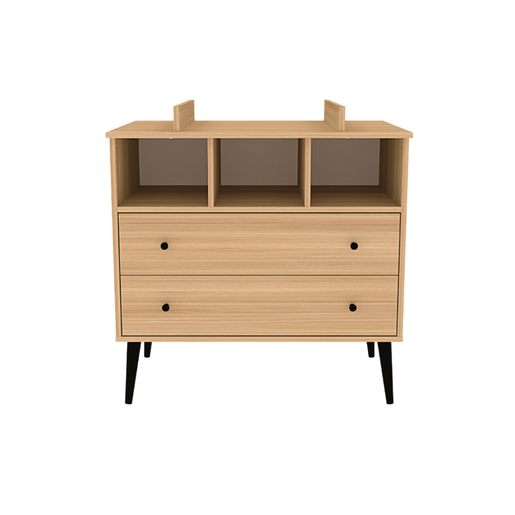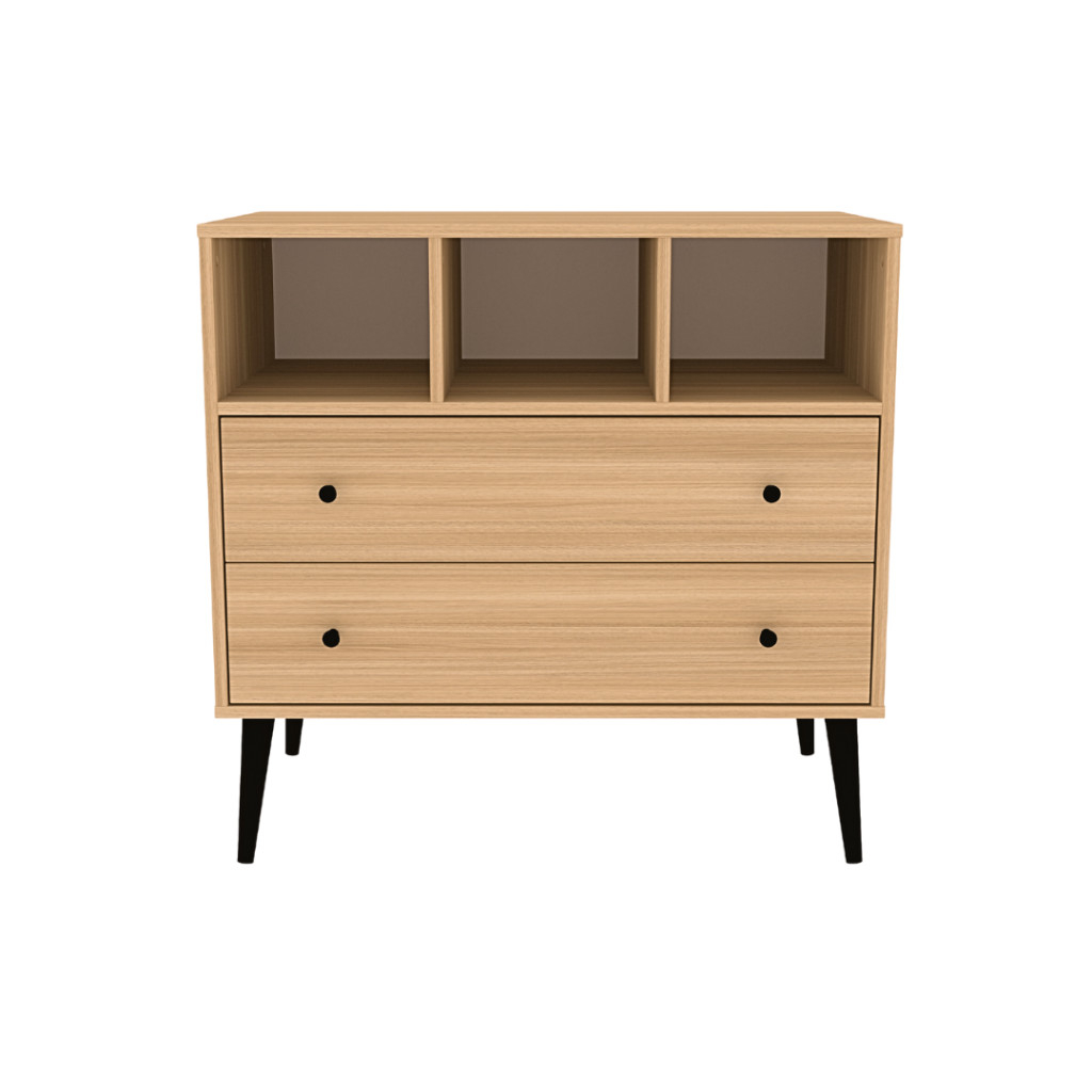 A Calma Oak komód modern formavilágával és fekete fogantyúival ill. lábaival a kollekció egyik ékköve. Letisztult, mégis karakteres tárolóbútor, amelyhez opcionálisan pelenkázó toldalék is rendelhető, így akár pelenkázókomódként is funkcionálhat. A komód felső harmadában 3 külön álló pakoló rész található, ami kiegészül további 2 db tágas, egyenként 50 L űrtartalmú fiókkal, melyekben bőséges hely áll rendelkezésre és arra várnak, hogy telis tele pakold baba holmikkal.