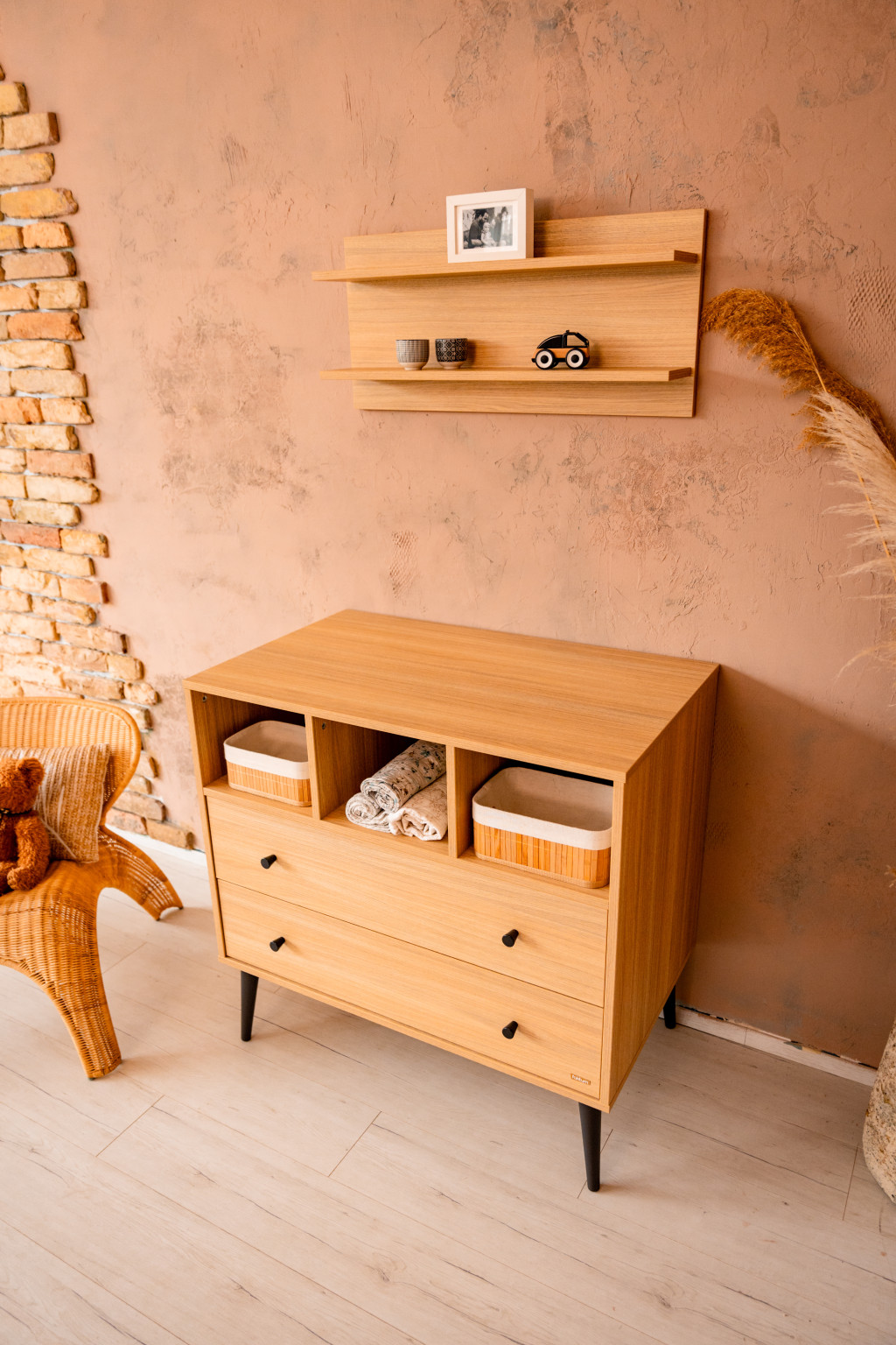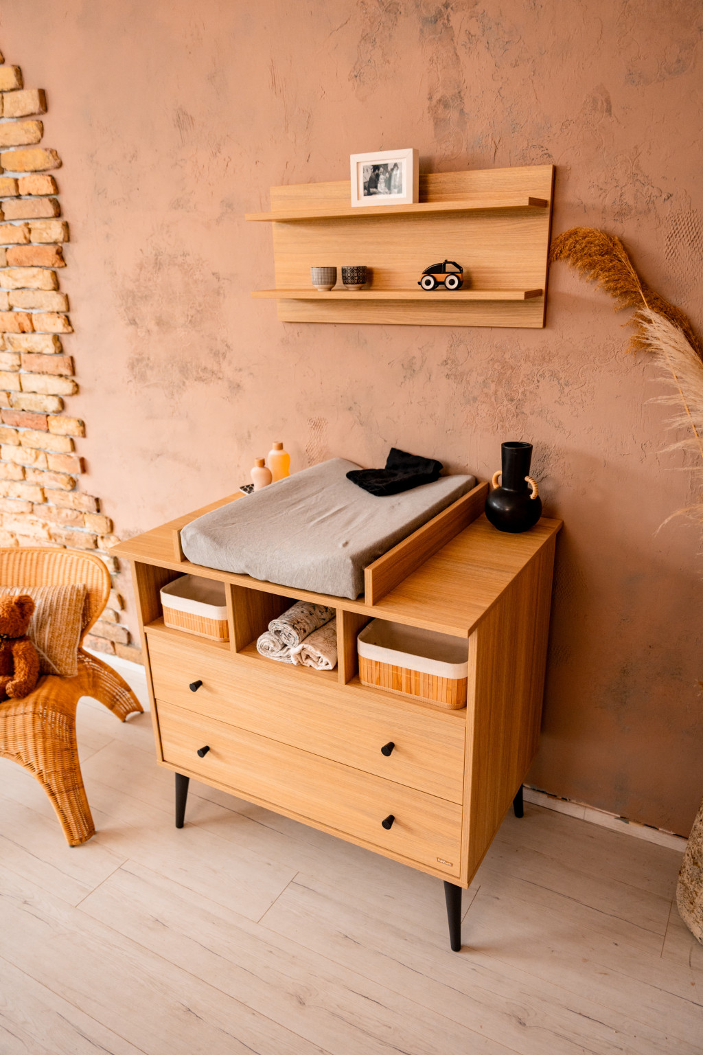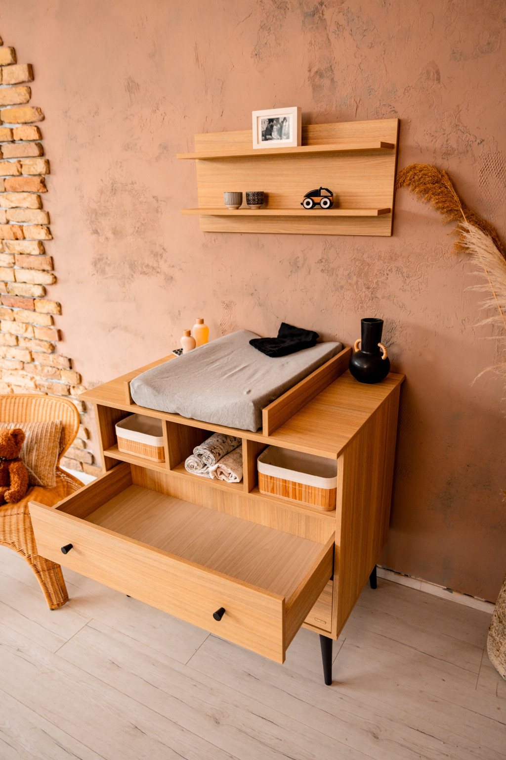 A Calma Oak komód modern formavilágával és fekete fogantyúival ill. lábaival a kollekció egyik ékköve. Letisztult, mégis karakteres tárolóbútor, amelyhez opcionálisan pelenkázó toldalék is rendelhető, így akár pelenkázókomódként is funkcionálhat. A komód felső harmadában 3 külön álló pakoló rész található, ami kiegészül további 2 db tágas, egyenként 50 L űrtartalmú fiókkal, melyekben bőséges hely áll rendelkezésre és arra várnak, hogy telis tele pakold baba holmikkal.