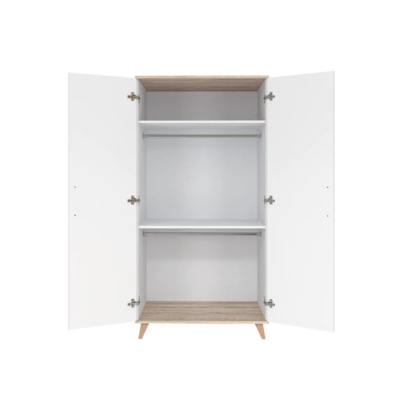 A FLIP White & Oak kétosztású szekrény tökéletes választás a babaszoba berendezéséhez, ha szeretnél elegáns, mégis praktikus tárolómegoldást. Két fix polc és két akasztórúd biztosítja, hogy minden ruha és kiegészítő könnyedén rendszerezhető legyen – a legkisebb bodyktól egészen a kamaszkori kedvenc darabokig.