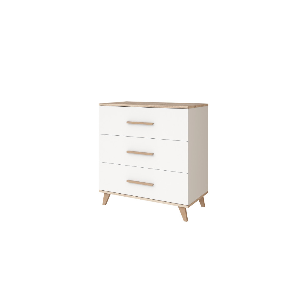 A komód négy karcsú lábon áll, a fehér felületeket fahatású tető és alj rész keretezi, ami modern, mégis otthonos megjelenést biztosít. A hosszúkás fogantyúk játékos karaktert visznek az összképbe. A termék rendelkezik TÜV minősítéssel, így biztos lehetsz benne, hogy a legszigorúbb biztonsági és minőségi elvárásoknak is megfelel – mert a babád biztonsága és kényelme mindig az első.