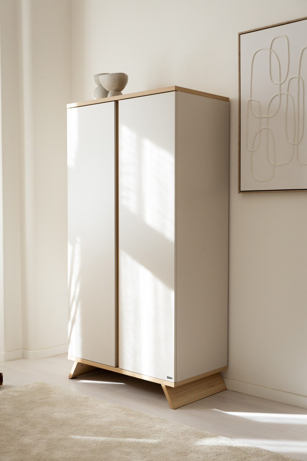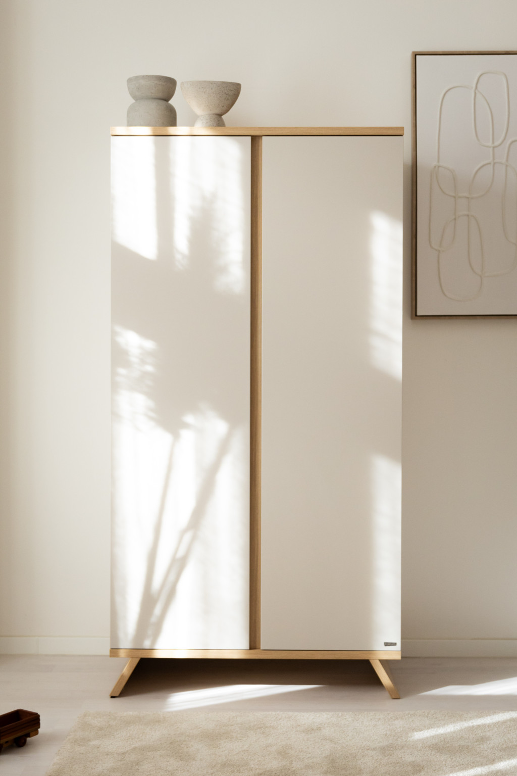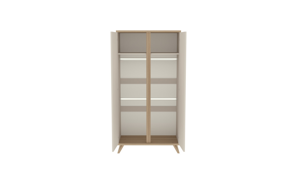 A Sienna Cappuccino 2 osztású szekrény a babaszoba nélkülözhetetlen tárolóbútoraként minden igényt kielégít. Praktikus belső akasztós kialakításának köszönhetően átláthatóan és könnyen kezelhetően tudod tárolni kisbabád ruháit. Továbbá a szekrényen belüli felső polc kialakítás a szekrény méreteinek kihasználását maximalizálja. Igény szerint további 3 db polccal is kiegészíthető.
