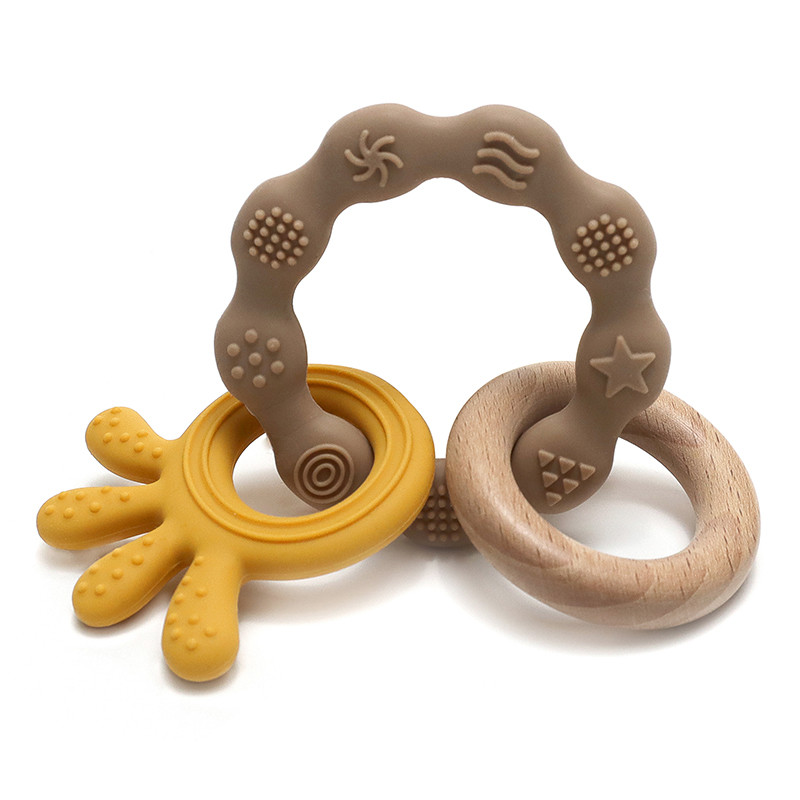 A puha szilikon rágóka 3 izgalmas elemet tartalmazó gyűrűből áll 2 gyűrű kizárólag élelmiszer-minőségű, BPA-mentes szilikonból,1 gyűrű, harapásbiztos bükkfából készült.