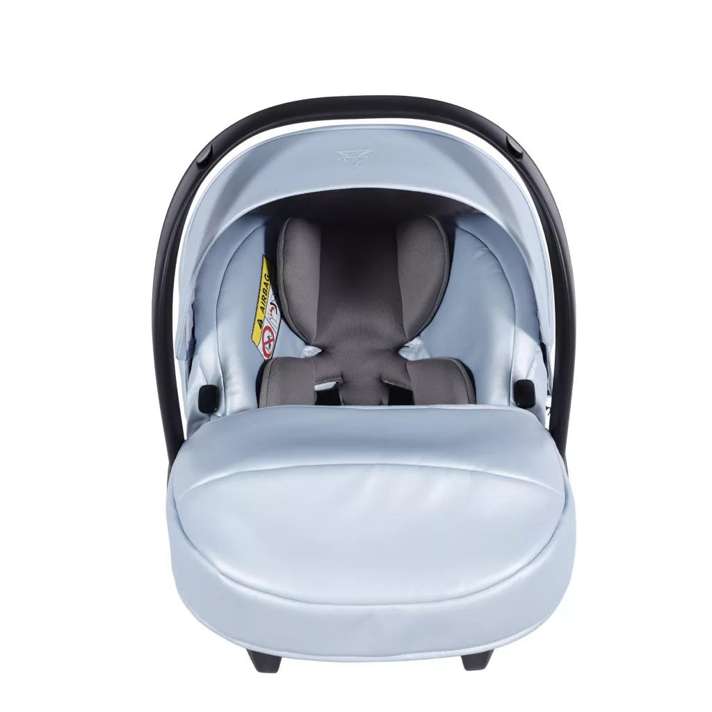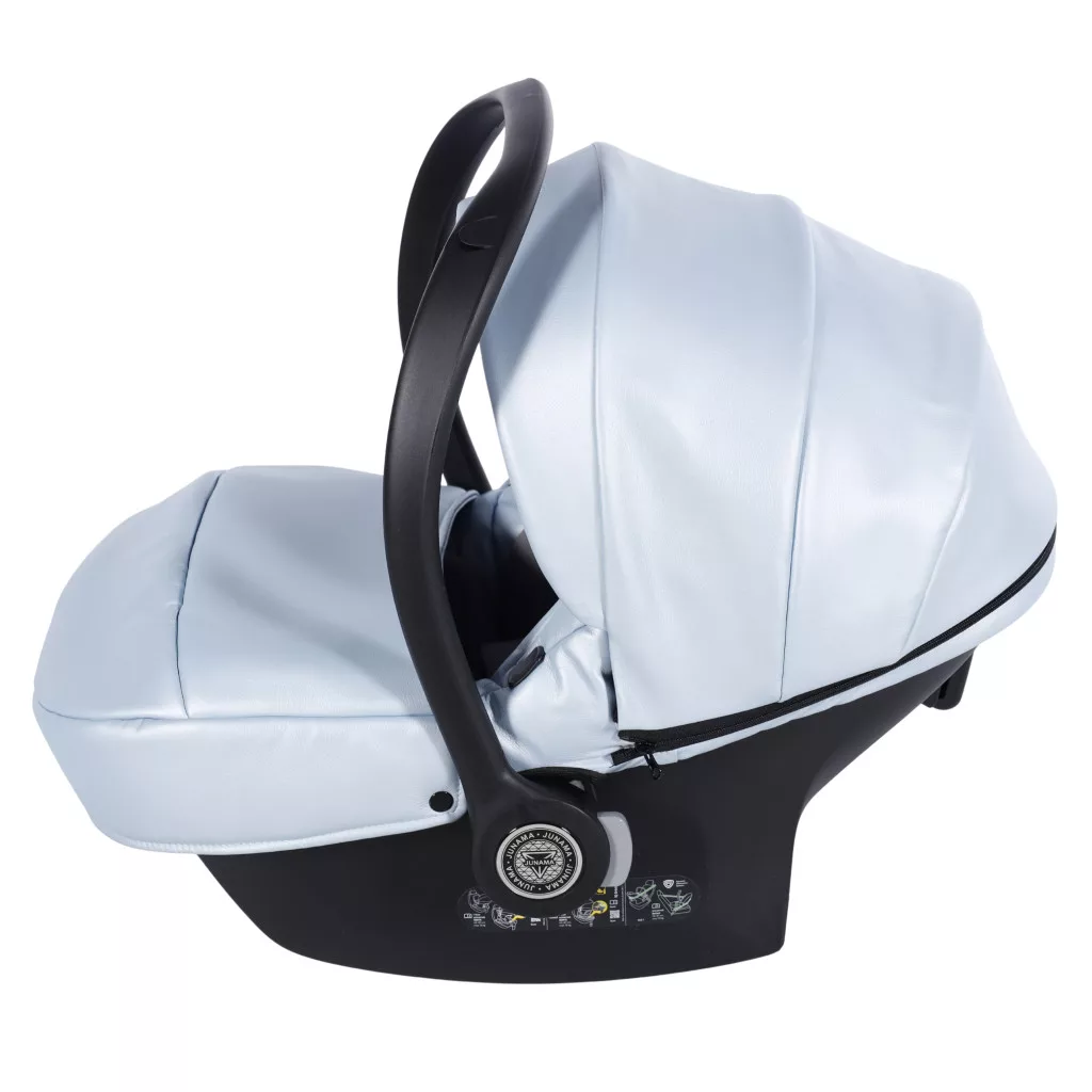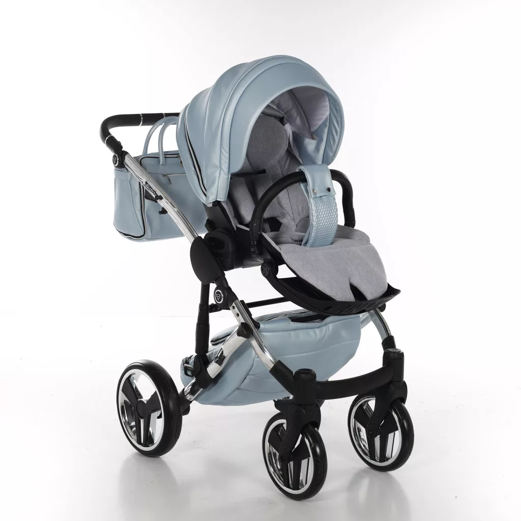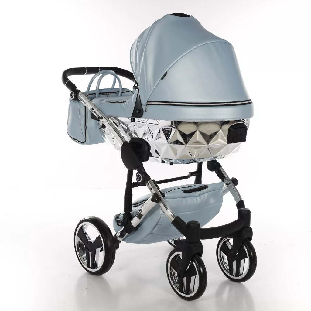 A Junama Diamond FLUO Glossy babakocsi - 08 Light Blue modell a finom, világos Light Blue árnyalatot ötvözi a látványos króm (Silver) vázzal és tükörfényes mózeskosárral. Elegáns, prémium és rendkívül exkluzív megjelenésű választás.