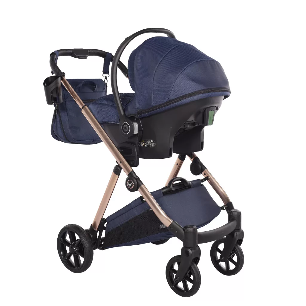 Elegáns kék árnyalat arany vázzal, steppelt prémium kidolgozással. A Junama ELLEGANTE - 06 blue 2in1 multifunkciós babakocsi luxus megjelenést, ultrakönnyű szerkezetet és négyévszakos komfortot kínál – exkluzív választás igényes szülőknek.
