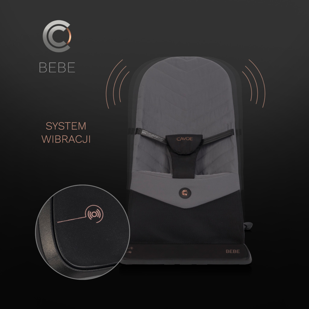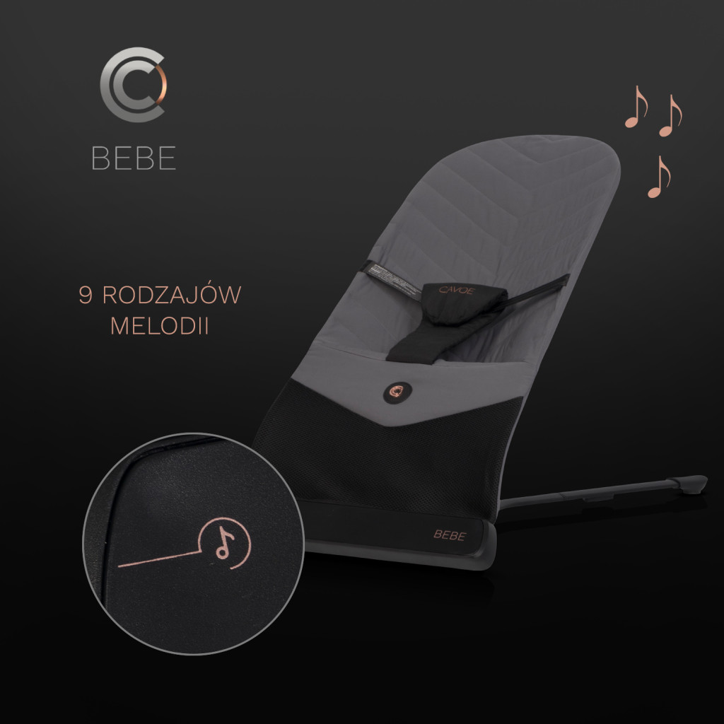 CAVOE BEBE rezgéssel és dallamválasztékkal ellátott Ergonomikus pihenőszék. Ez a kivételesen elegáns kollekció a CAVOE jellegzetes stílusában készült termékeket tartalmaz. A mélyfekete és kiváló minőségű anyagok, diszkréten rozéarany fém díszítéssel kiegészítik a CAVOE HOME sorozat főbb erősségeit: az innovációt és a funkcionalitást. A CAVOE HOME sorozat megalkotásakor a tervezők mind a gyermeked, mind a saját kényelmed kényelmét figyelembe vették.